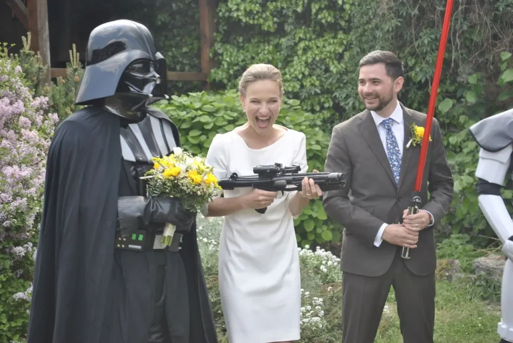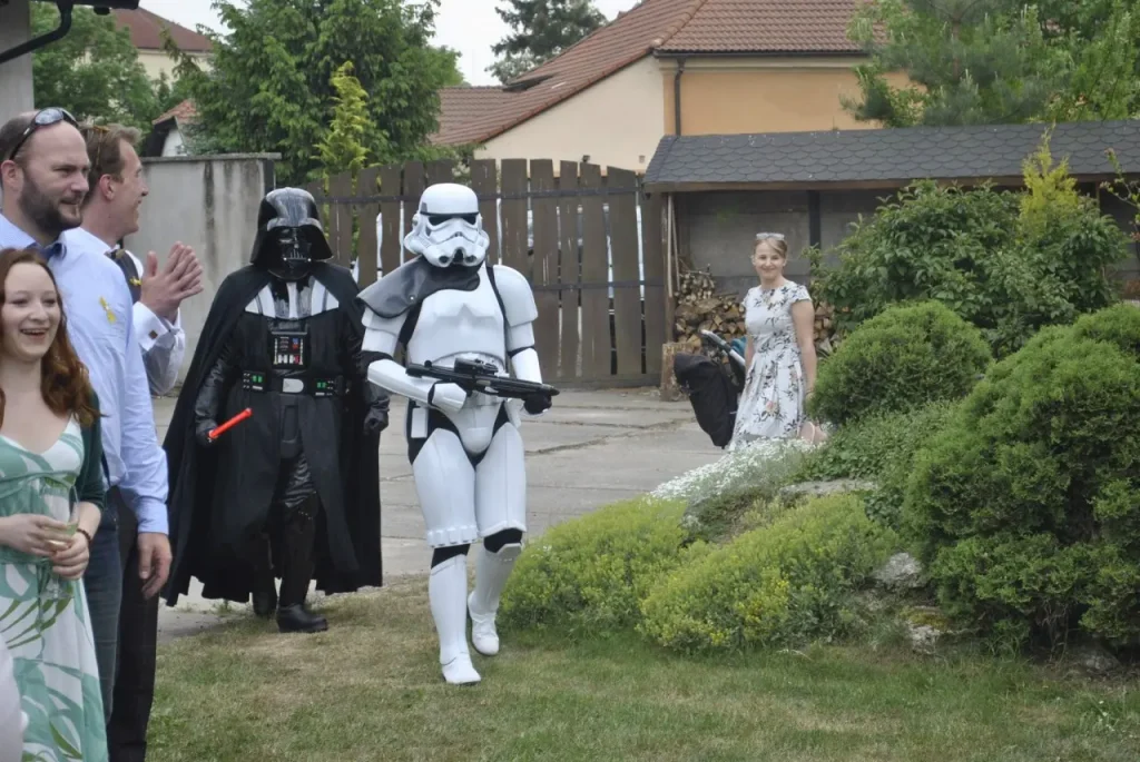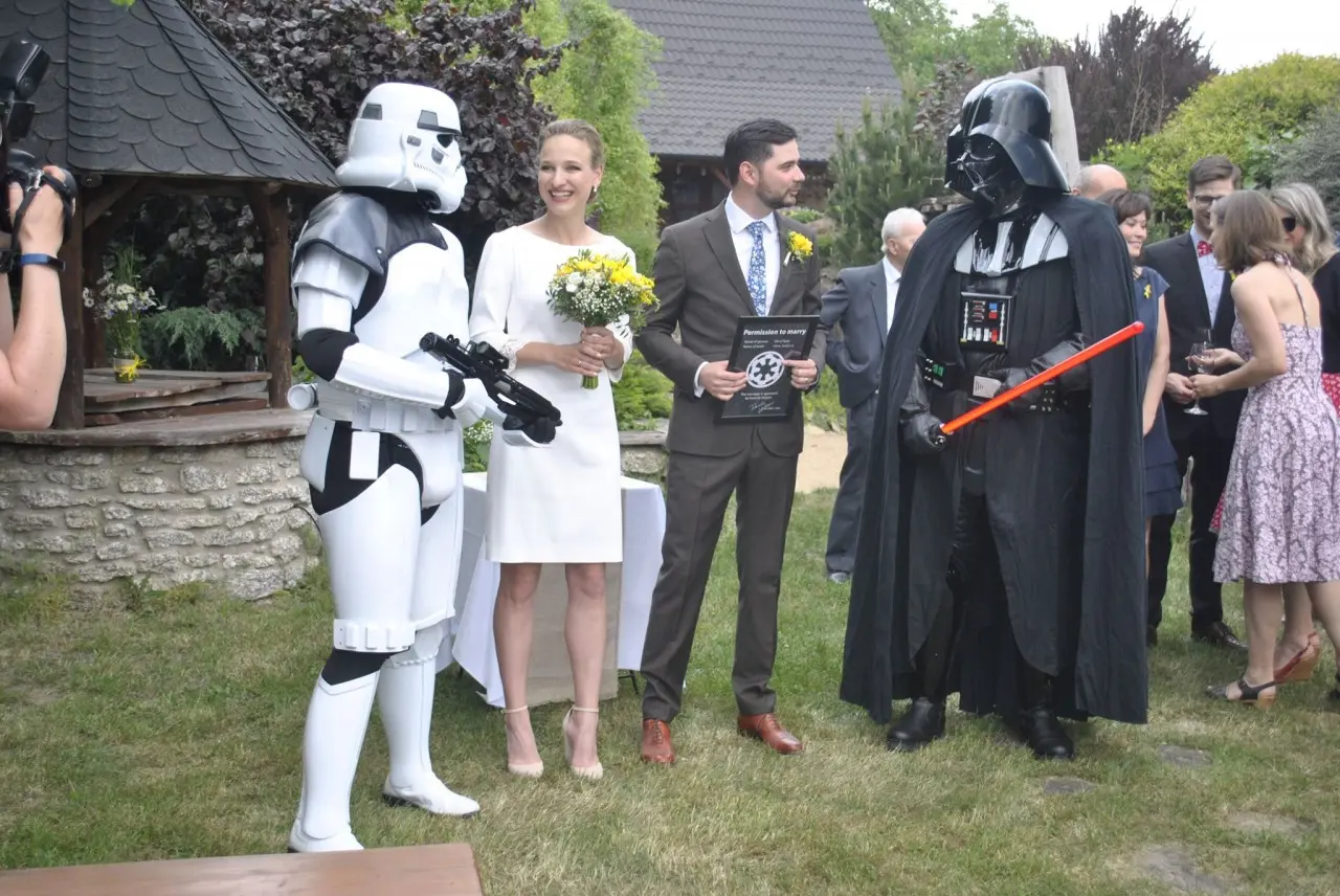 Členové CzG zavítali 12. května na svatební obřad ve Škvorci. Jelikož ženich je příbuzný jednoho z našich členů a skalní fanda Star Wars, rozhodli jsme se, že mu nachystáme menší překvapení. A tak ve chvíli, kdy ke konci obřadu poslední svatebčan popřál novomanželům, napochodovali na místo za znění Imperiálního pochodu Darh Vader a Stormtrooper a přidali se ke gratulaci poněkud překvapeným novomanželům. Následovalo společné focení se svatebčany a krájení svatebního dortu světelným mečem. Rádi bychom poděkovali všem, kteří se podíleli na organizaci tohoto milého překvapení.